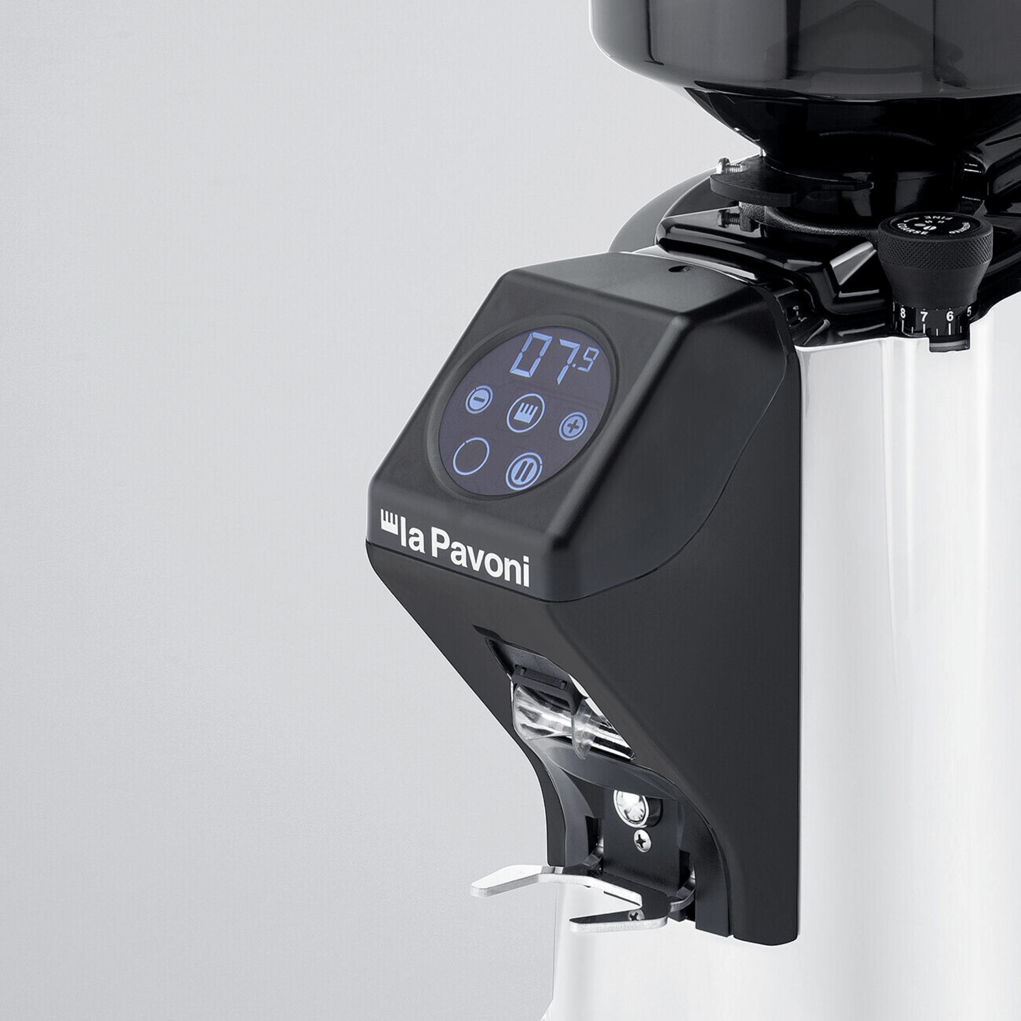 The La Pavoni Zip Pro is an on demand coffee grinder. It is operated using a touch screen interface and uses a stepless micrometric adjustment system.